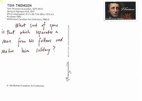 My most recent project, executed in August 2019. Back in college, I sent a few postcards to a friend with landscape paintings on the front and quotes from Walden on the back. A couple of years ago I found these US postage stamps with Thoreau's face and signature on them and thought they would be perfect for another bout of postcards. I had been searching for the right postcards to use and came across this collection of landscape paintings by Tom Thomson. It featured woods and lakes; perfect! I took time to match each quote to a specific painting and then to place the postcards in a curated order. As a performance aspect of the project, I've been mailing them all the way across the country to my grandmother.